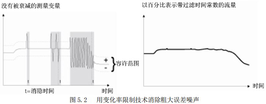 “變化率限制值”與“不敏感時間值”是用來消除某些增加阻尼不能除去的噪聲。它能夠從真實的流量信號中判別出階躍信號引起的噪聲和漿液尖狀噪聲。這種判別是以變化率的限制和持續(xù)時間為依據(jù)的。圖 5.2 所示為使用變化率限制技術(shù)去除粗大誤差的原理說明。該功能為在前面采樣中獲得的流量數(shù)據(jù)經(jīng)一階濾波后的,設(shè)定某一上限和下限(變化率)。如果當(dāng)前采樣的流量數(shù)據(jù)超過或低于這個*限值,而且在超過或低于這個*限值的變化時間之內(nèi),則認(rèn)為這種變化是由于噪聲所引起的,CPU 予以切除;而當(dāng)超過或低于這個*限值的變化在設(shè)置的不敏感時間以外,則認(rèn)為這種變化是由于真正的流量變化所引起,CPU 就認(rèn)可是測量流量的變化。